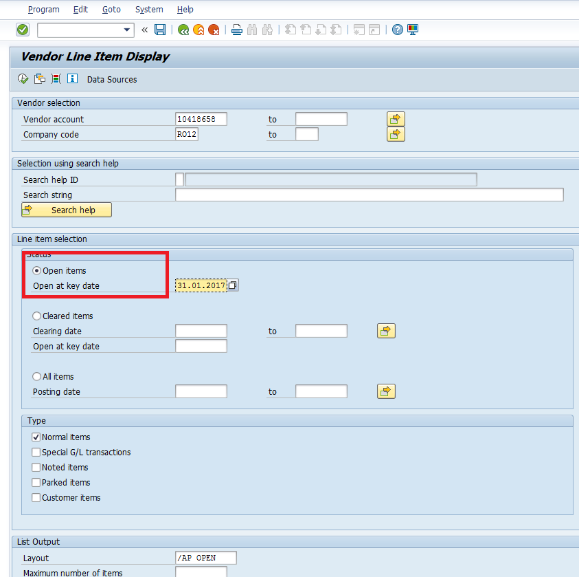 Or directly start the transaction FBL1N from the command field. Enter Vendor account number and Company code. And then, select Open items to view open items. Input the key date for open items view.