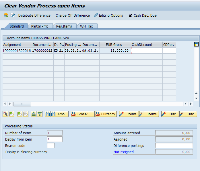 Next step is to assign the documents to be cleared by double clicking on each of them. We can go further to process the clearing only if the field Not assigned shows that the items assigned to be cleared are balanced to 0.