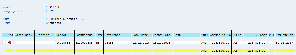 The transaction is displaying the Open Items marked with red in the Status column. There is no Clearing document for the moment, because this document will be cleared as per the date from Net due date column when the invoice will be paid.