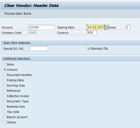 The first step is to enter the selection criteria (Account, Company Code, Clearing Date, and Period), mention if the clearing will refer to special G/L transactions (e.g., down payments), and if it will include standard open items accounts.