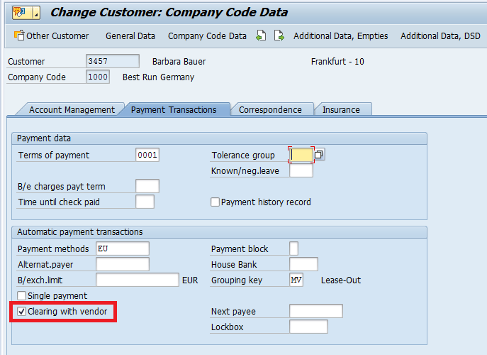 3. Choose “Clrg with vend” and “Clrg with cust” in the company code data section in both the customer and the vendor master records.