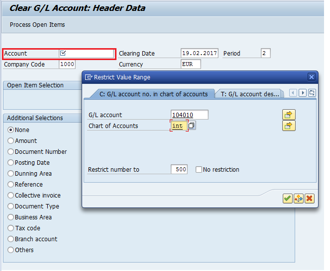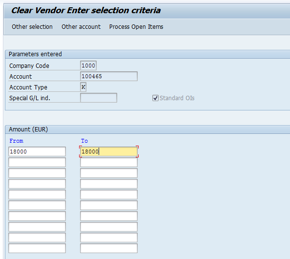 To proceed with the clearing process, click Process Open Items button. The SAP system will show a screen where you will need to specify the additional criteria for document numbers. We will enter the document numbers that FBL5N transaction showed us.