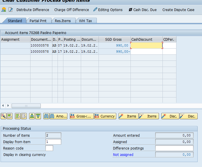 On the next screen, select the open items to be cleared by double clicking on the lines and check that the Not assigned field is balanced to 0.