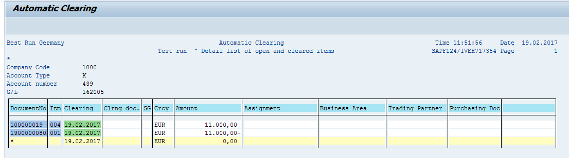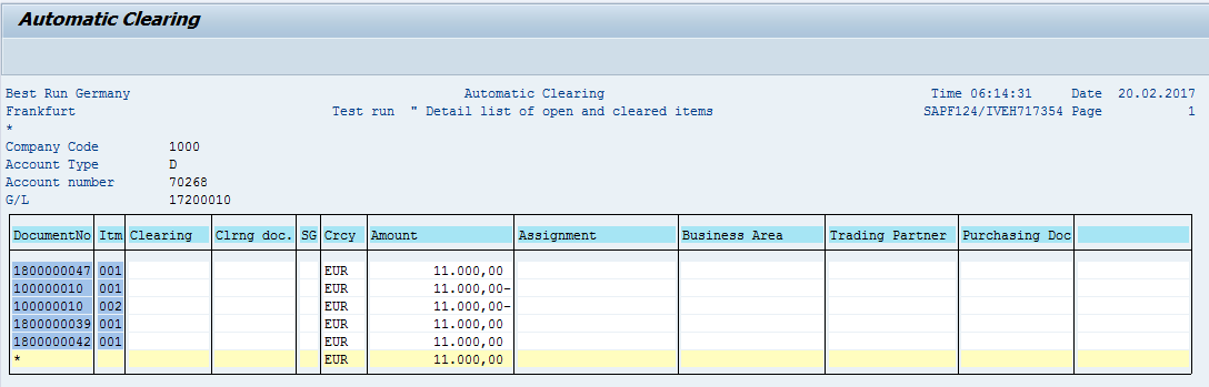 The SAP system will take you the next screen of the transaction and generate a list of the documents that are proposed by the system to be cleared.