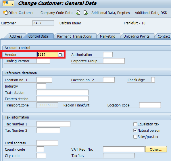 2. Enter the customer account number in the customer field in the control section of the general data in the vendor master record (transaction FK02).