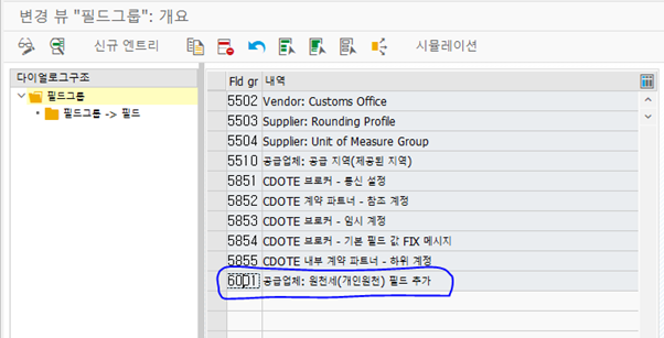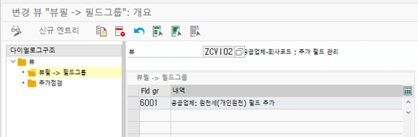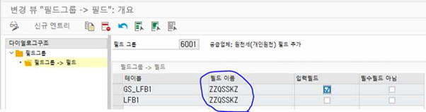 - 신규 '필드 그룹' 생성 및 필드 지정(GS_LFB1 : 화면 출력용 구조체)