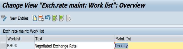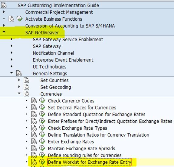 - SPRO –> IMG –> SAP NetWeaver –> General Settings –> Currencies –> Define Worklist for Exchange Rate Entry